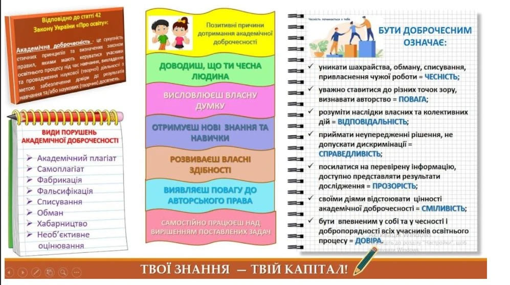інтерактивний відеоурок ,практичні завдання, обговорення прикладів із життя. Це дає можливість дізнатися як доброчесність починається з простих щоденних вчинків.